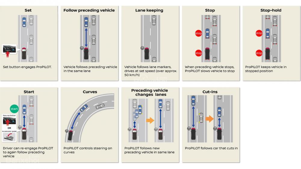 Bên cạnh đó, ProPilot sẽ giúp xe dừng hoàn toàn mà người lái không cần để chân lên bàn đạp phanh cũng như giúp xe đi đúng làn định sẵn. ProPilot được kích hoạt bằng các nút gắn trên vô-lăng và chiếc xe sở hữu màn hình hiển thị để hành khách theo dõi hiệu suất của hệ thống. Cũng giống như AutoPilot của Tesla, Nissan ProPilot yêu cầu người lái để tay trên vô-lăng để có thể giành quyền điều khiển xe bất cứ lúc nào.