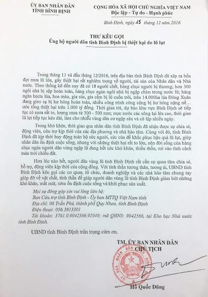 Ngày 15.12, ông Hồ Quốc Dũng - Chủ tịch UBND tỉnh Bình Định - đã gửi thư kêu gọi ủng hộ người dân tỉnh Bình Định bị thiệt hại do lũ lụt. Trong 4 đợt mưa lũ lớn trong tháng 11 và đầu tháng 12.2016 tại Bình Định đã gây thiệt hại rất nghiêm trọng về người, tài sản, ước tính tổng thiệt hại trên 1.000 tỷ đồng